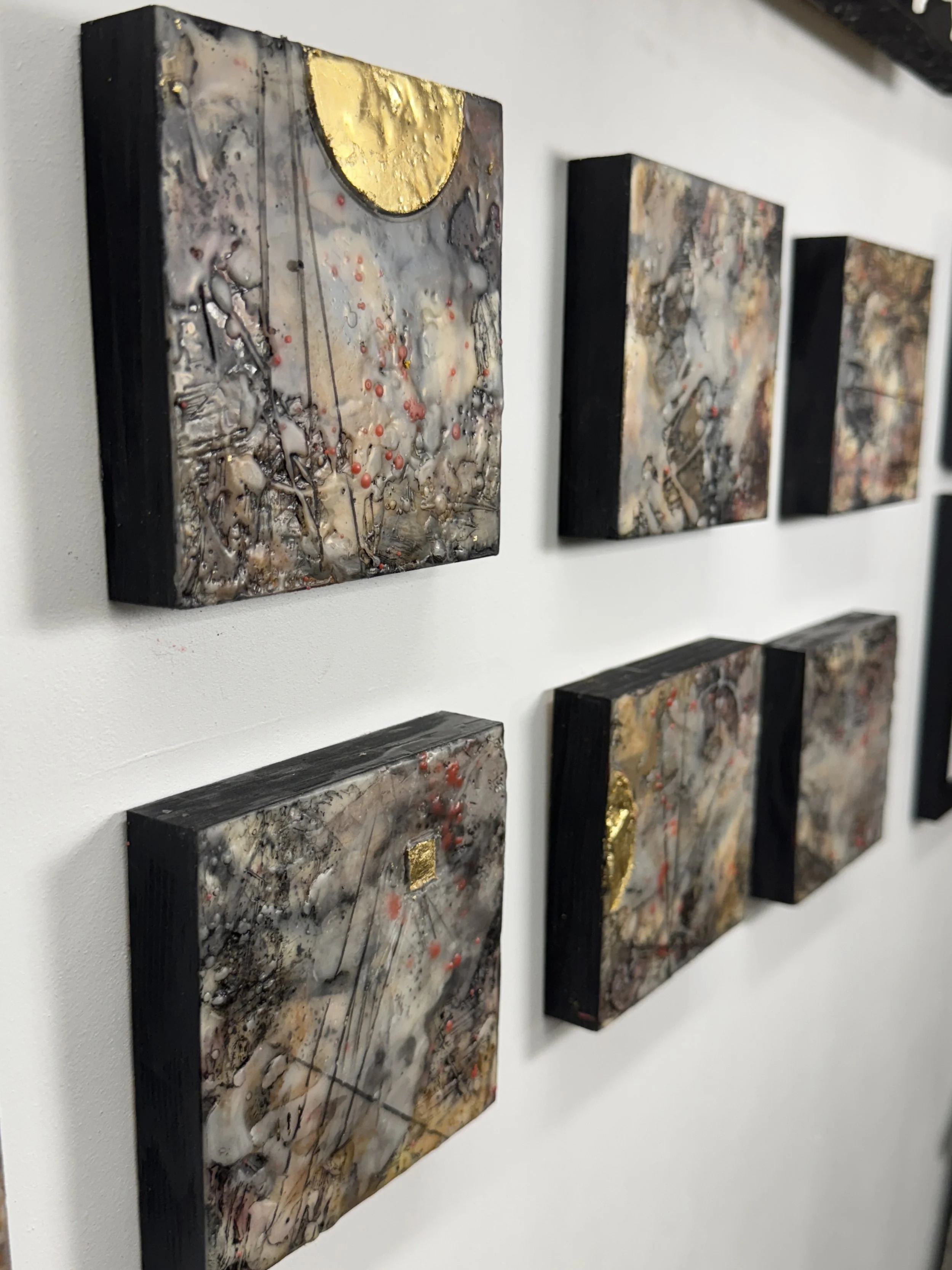 Made from location specific materials gathered during an art residency in Ireland these pieces are made with encaustic, peat ash, carbon based paints, gold leaf and holy water from St. Brigid’s well.