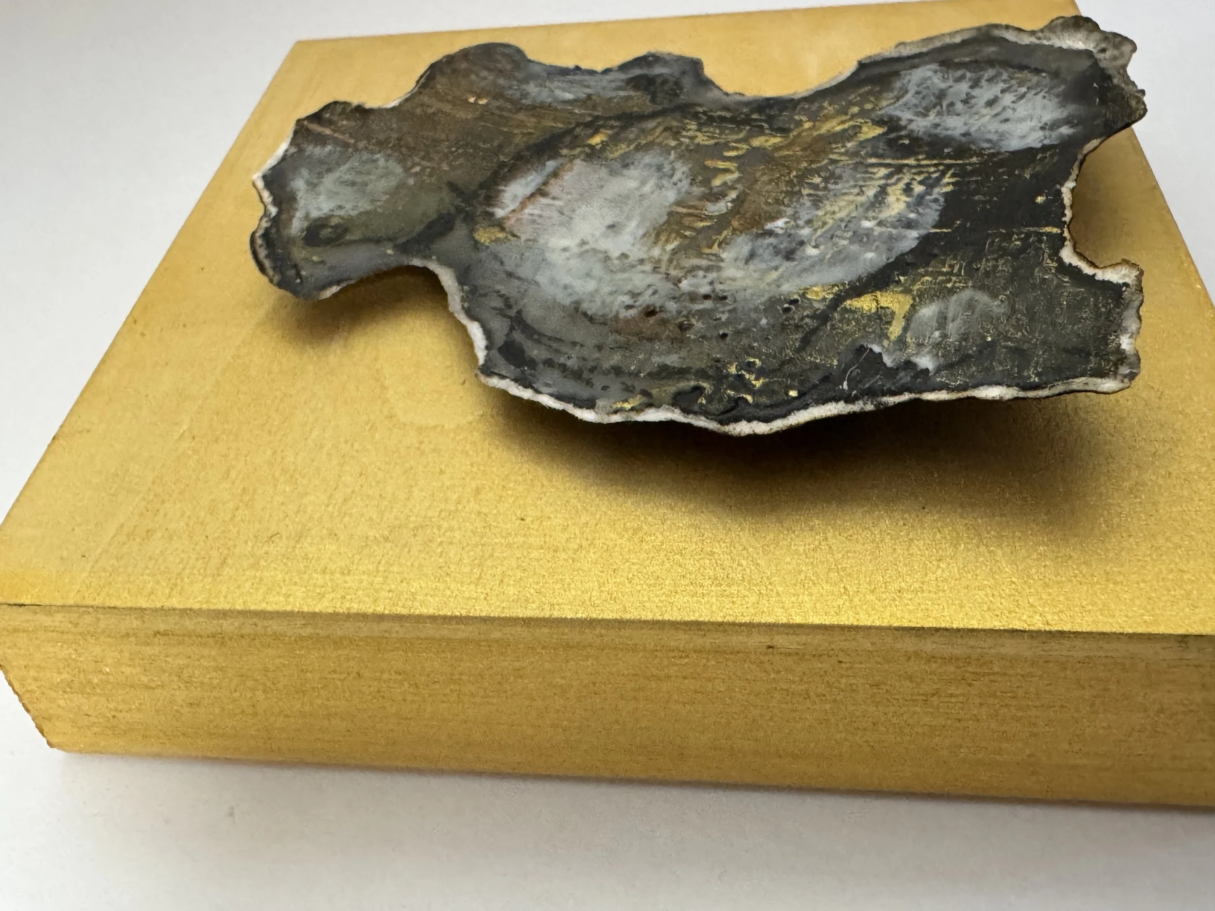 Encaustic, Peat Ash, Carbon, St. Brigid's Holy Water on torn, burnt and paper magnet mounted on 9×12 black panel